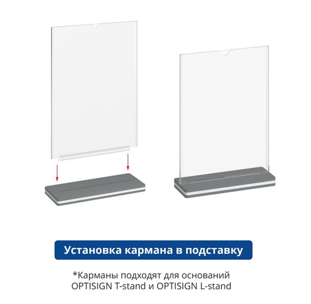 Карман подставки под меню OPTISIGN — это элемент конструкции, предназначенный для размещения информационных материалов формата А4 и А5. Он крепится к основанию подставки и позволяет легко менять содержимое благодаря верхней загрузке. Карман крепится к основанию под углом 90° или 75° . Карман крепится к основанию через отверстие, расположенное в центральной части