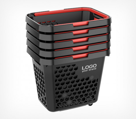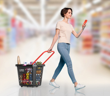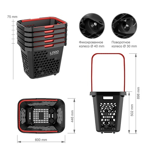 Особенности корзины-тележки TECHNO XL: эргономичная ручка с фиксатором для удержания её на уровне руки покупателя; усиленная конструкция дна гарантирует длительную эксплуатацию; варианты цвета ручек: красный, салатовый, синий, оранжевый, чёрный; два способа брендирования: шёлкография или стикер; легко штабелируются одна в другую; габаритные размеры (длина * ширина * высота): 600 * 446 * 502 мм.