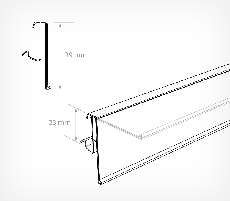 Ценникодержатель полочный CFA39 предназначен для полок CEFLA и других типов полок с высотой посадочного места 23 мм. Обеспечивает надёжное крепление на краю полки.