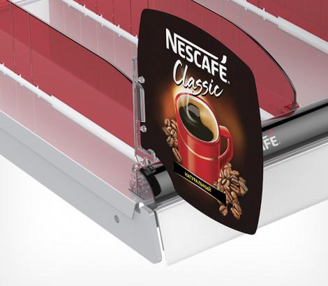 Используется передний профиль с ценникодержателем. Высота рекламной вставки - 30 мм. Имеет Т-профиль для крепления разделителей и толкателей. Крепится на полку на двухсторонний скотч.