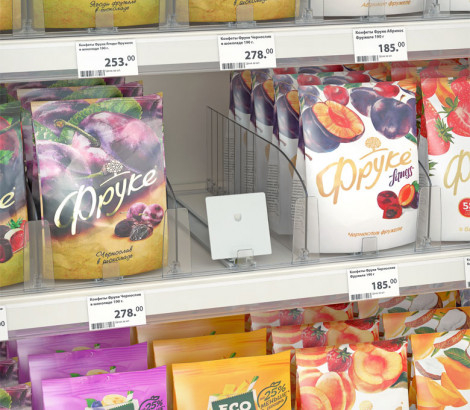 Пружинный толкатель FORTA QUADRA-1 имеет наклонную толкающую поверхность размером 75х74 мм и передний ограничитель 20х25 мм. Подходит для невысоких продуктов средней и высокой тяжести, например: квадратных плиток шоколада, конфет в пакетированной упаковке.