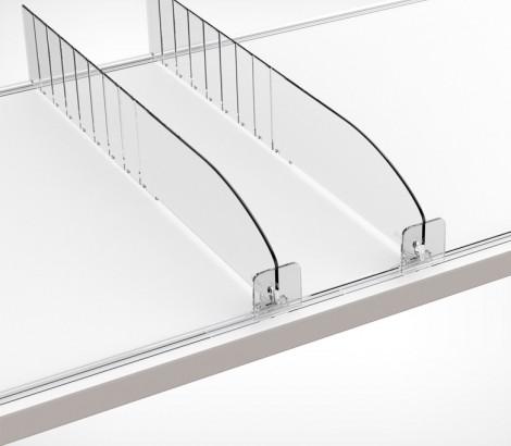 Разделитель DIV60-BT60 выс.60 мм с передним огран.60 мм — пластиковый разделитель с передним ограничителем. Имеет насечки с шагом 25 мм для обламывания по длине, материал: прозрачный ударопрочный пластик. Применение: для организации выкладки небольших лёгких товаров, таких как сигареты, лекарства, парфюмерия и косметика.