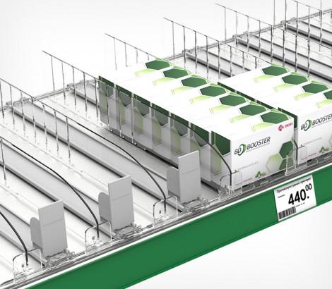 Пластиковая задняя опора используется индивидуально или в комплекте с ребристым профилем BACKLINE. Ребристые выступы в нижней части опоры удерживают плоские упаковки товара, обеспечивая его идеальную подачу покупателю.