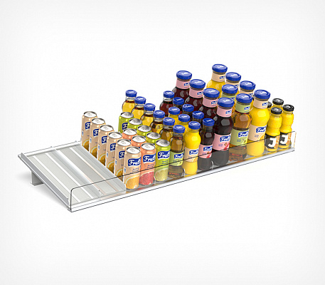 Основная часть полки - роллерное полотно, по которому продукты перемещаются к краю полки. Легко устанавливается на полку стеллажа и проста в обслуживании.